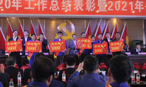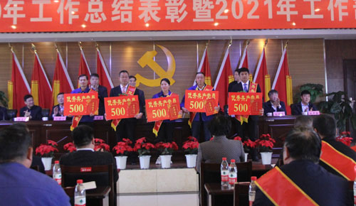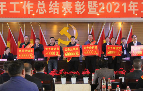 优秀经销商上台领奖 会议对先进个人、先进集体、劳动模范及优秀经销商进行了表彰奖励。先进典型代表分别发表了获奖感言。集团分管领导及各分公司负责人就如何做好2021年的工作作了表态发言。
