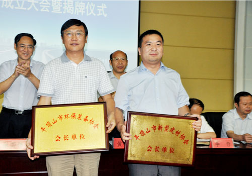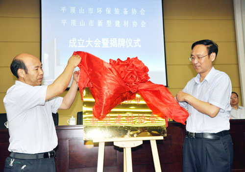 市长张国伟、统战部部长黄祥利为平顶山市新型建材协会揭牌